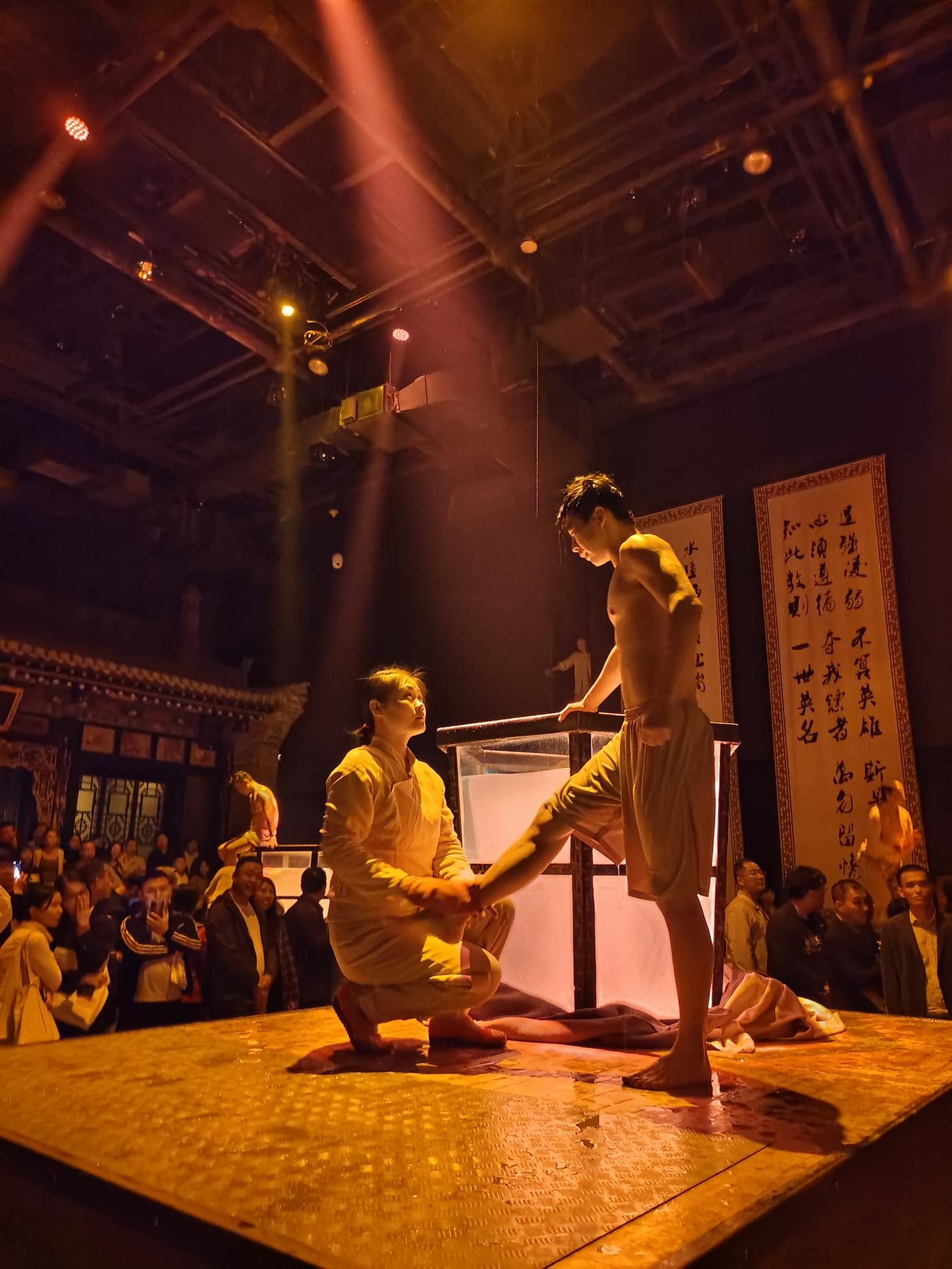 《又見平遙》是根據(jù)平遙古城歷史以及文化推出的一部震撼人靈魂的大型情景劇演出,沒有座位,沒有舞臺與觀眾席的界限。大家身在實景中,身邊是穿著另一個時代服裝的演員,在晦暗燈光的映襯下,有穿越歷史的恍惚。
